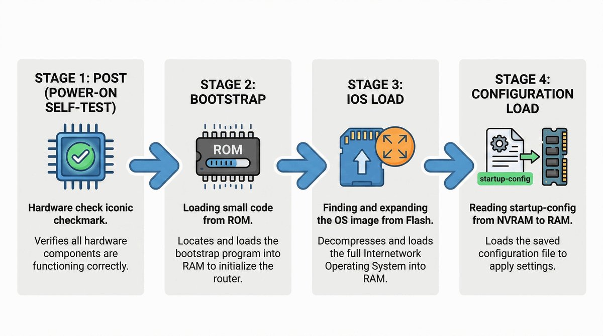 - 3. Ładowanie Systemu (IOS): Odnalezienie i dekompresja obrazu systemu z pamięci Flash do RAM.