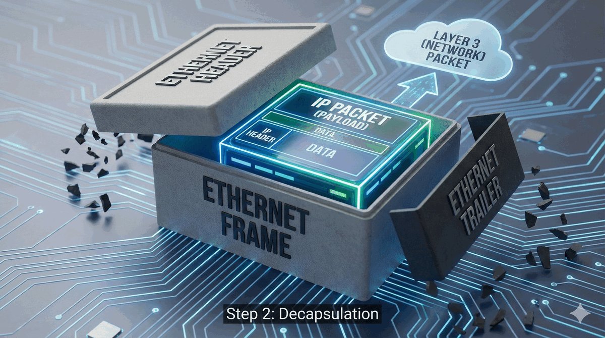 - Wydobywa z wnętrza pakiet IP i przekazuje go do procesora sieciowego.