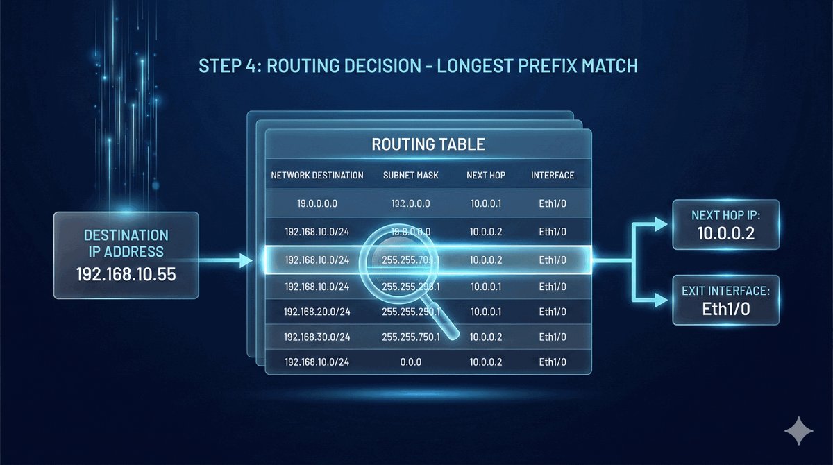 - Router przeszukuje tablicę routingu, aby znaleźć ścieżkę do sieci docelowej.