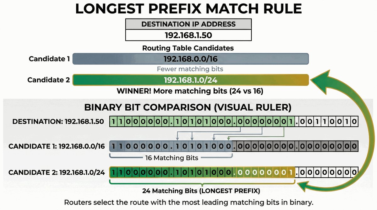 - Zasada "Longest Prefix Match" nakazuje wybrać najbardziej szczegółową trasę (z najdłuższą maską).