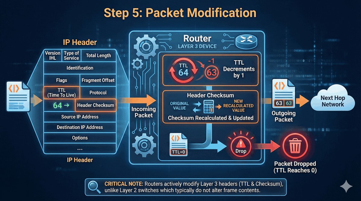 - TTL (Time To Live): Wartość jest zmniejszana o 1. Zapobiega to wiecznemu krążeniu pakietów w pętlach.
