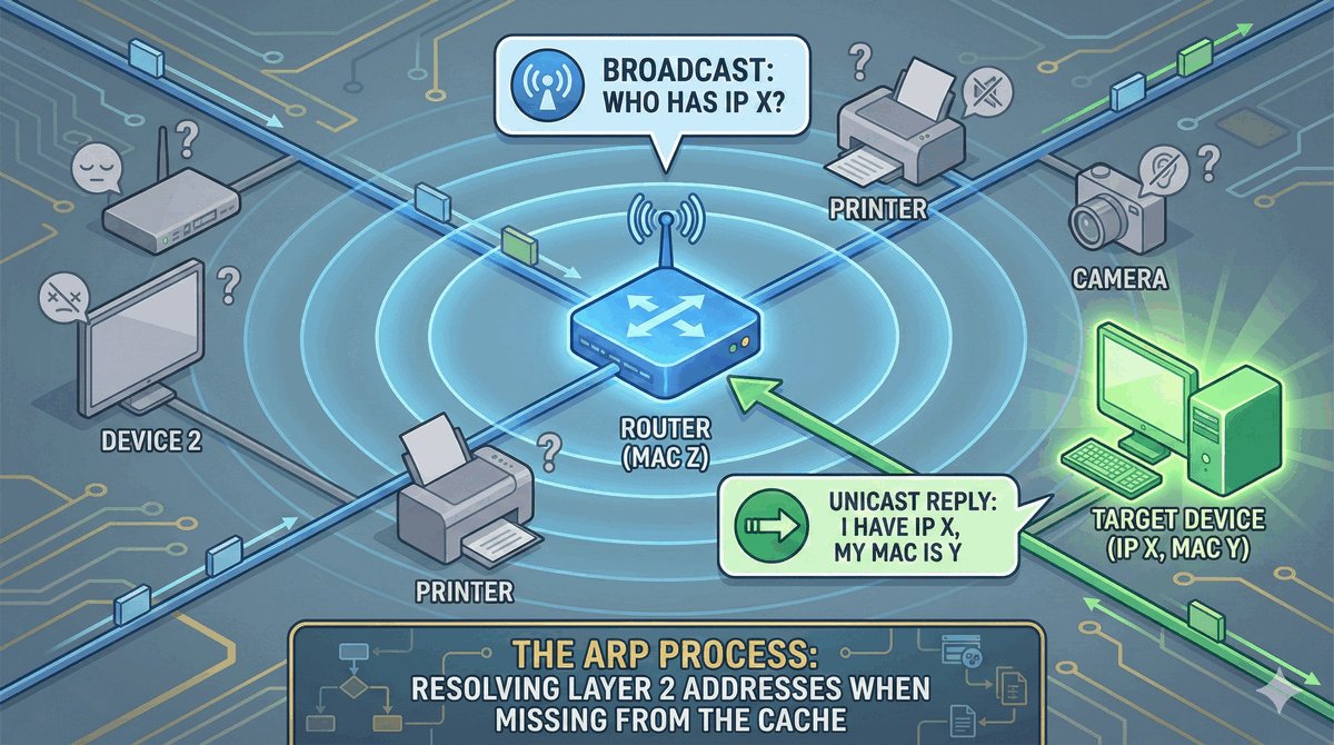 - Router wysyła zapytanie rozgłoszeniowe (broadcast): „Kto posiada adres IP X.X.X.X?”.
