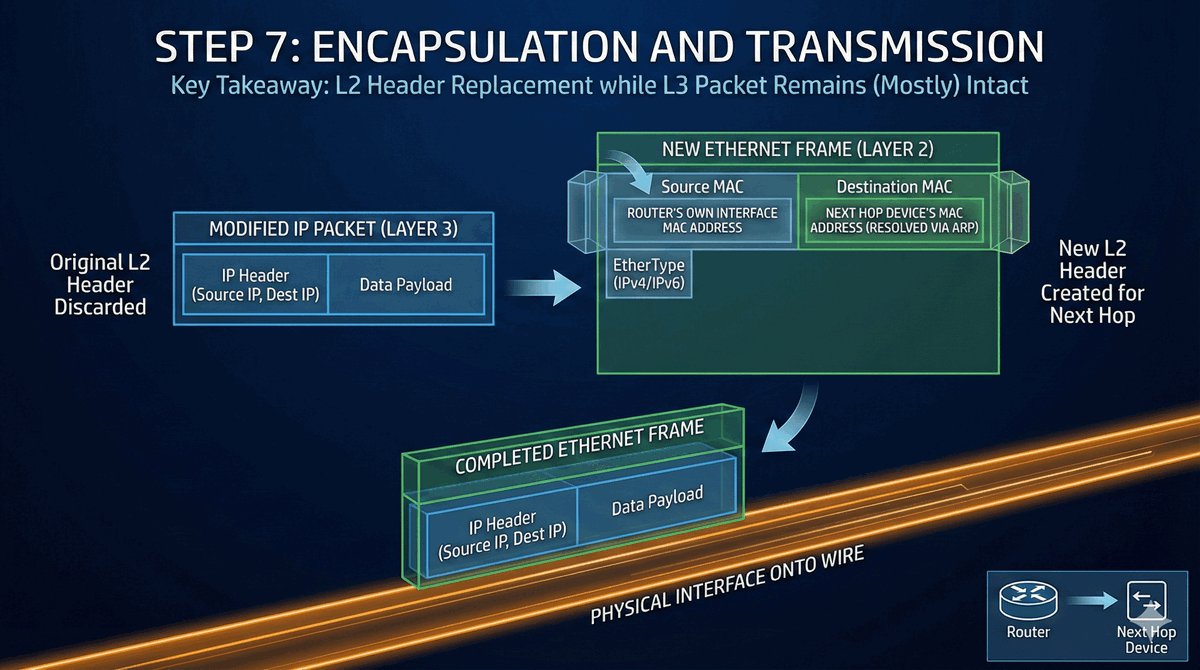 - Router musi teraz zapakować pakiet IP z powrotem w ramkę Ethernet.