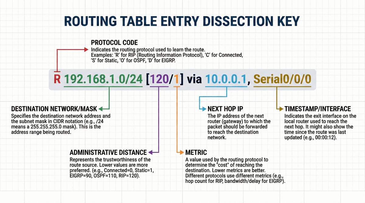 - Kodu źródła: Określa, skąd router „dowiedział się” o trasie (C — podłączona, S — statyczna, etc.).