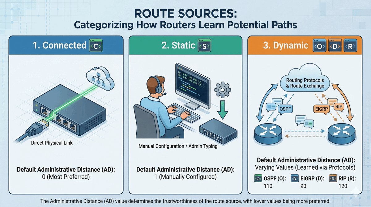 - S (Static): Kierunki wprowadzone ręcznie przez administratora. Bardzo wiarygodne (AD=1).