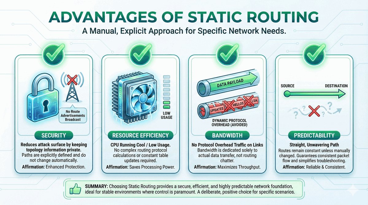 - Routing statyczny jest idealnym fundamentem dla stabilnych i bezpiecznych mniejszych sieci.