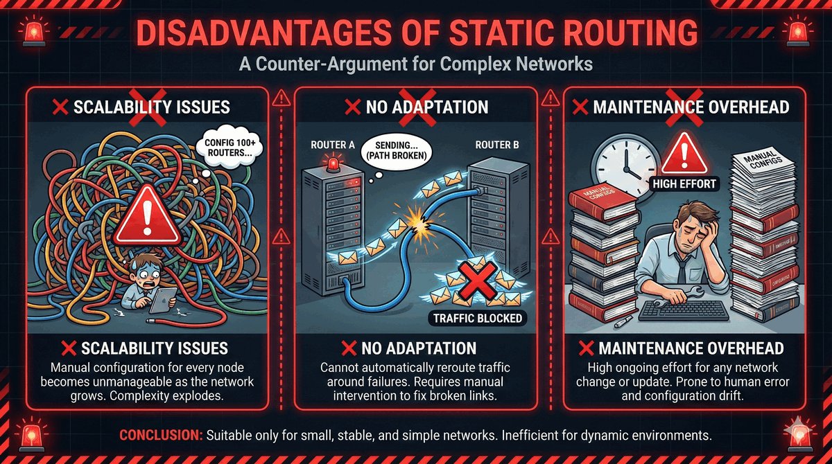 - Brak responsywności: W przypadku awarii fizycznego łącza trasa statyczna nie zniknie sama.
