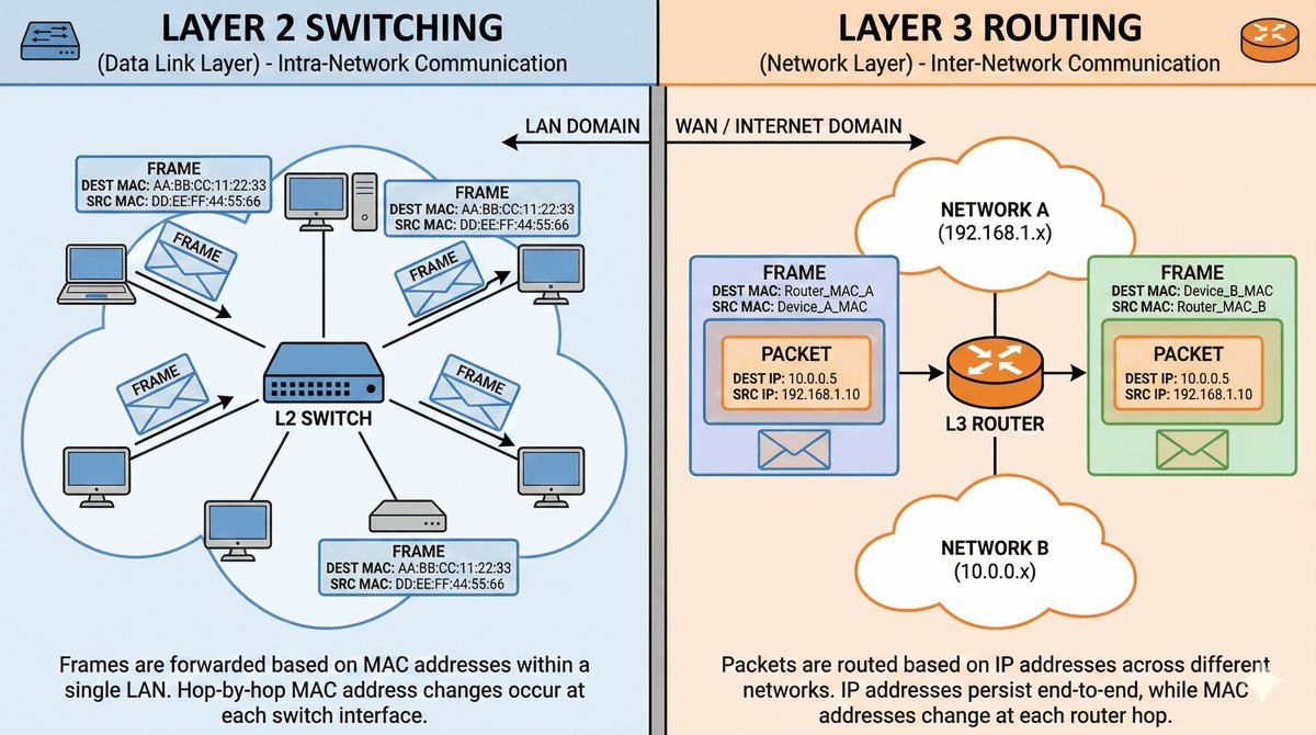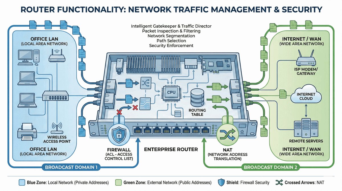 - Router: Pracuje w L3, operuje na adresach logicznych IP między różnymi sieciami.