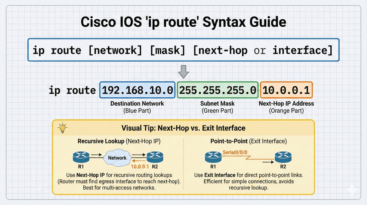 ip route [sieć_docelowa] [maska] [następny_skok_IP | interfejs]