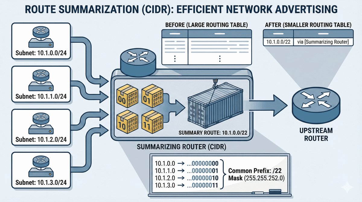 - Zamiast wymieniać podsieci 10.1.0.0, 10.1.1.0, 10.1.2.0 i 10.1.3.0, używamy zapisu 10.1.0.0/22.