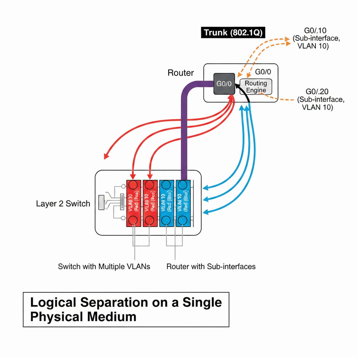 - Pojedynczy fizyczny interfejs jest dzielony na wirtualne subinterfejsy (poddzielone logicznie).