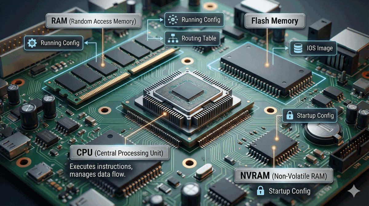 - NVRAM: Specjalna pamięć nieulotna na plik konfiguracji startowej (startup-config).
