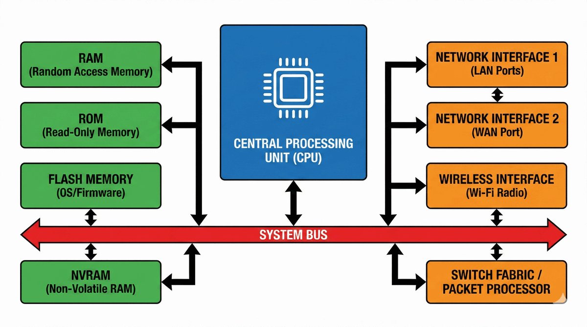 - RAM: Przechowuje aktualną tablicę routingu, tablicę ARP, konfigurację bieżącą oraz bufory danych.