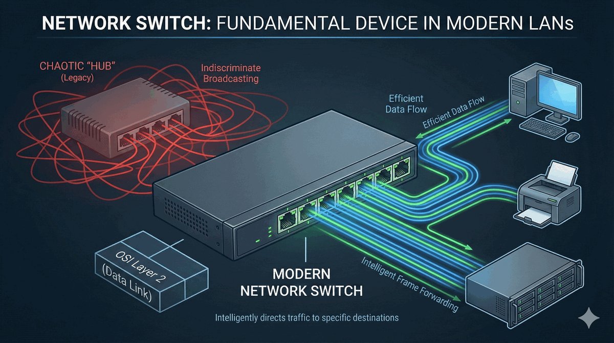 - Zastąpił starsze technologie, takie jak koncentratory (huby).
