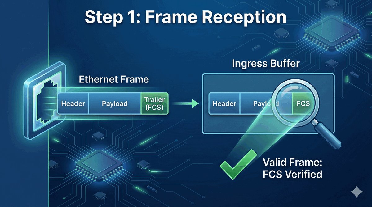 - Przełącznik sprawdza sumę kontrolną FCS, aby upewnić się, że dane nie uległy przekłamaniu.