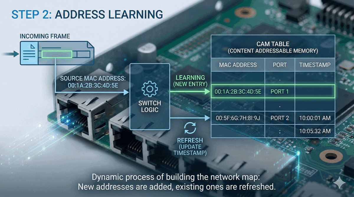 - Jeśli adres już istnieje, przełącznik odświeża czas życia (aging timer) tego wpisu.