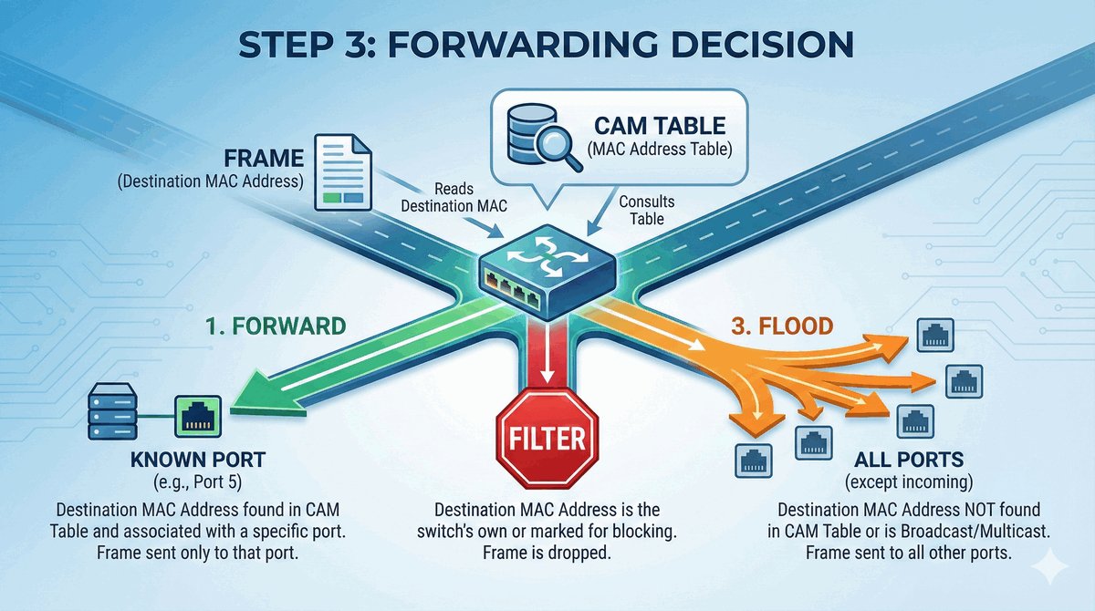 - Podejmowanie decyzji o przekazywaniu lub filtrowaniu ramek (Forward/filter decision).
