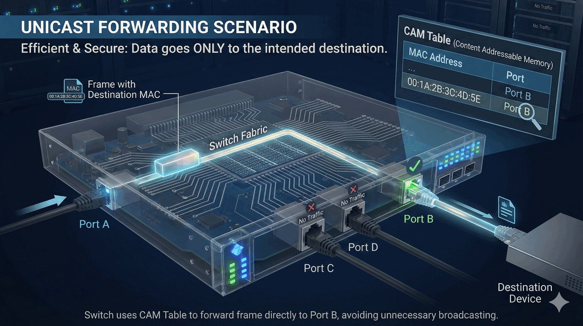 - Ma miejsce, gdy docelowy adres MAC jest znany w tablicy CAM.