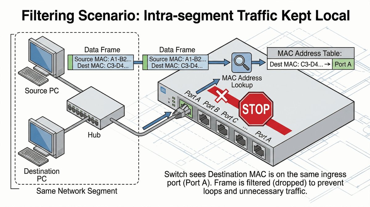 - Ramka zostaje odrzucona (odfiltrowana), co zapobiega zbędnemu powielaniu ruchu.