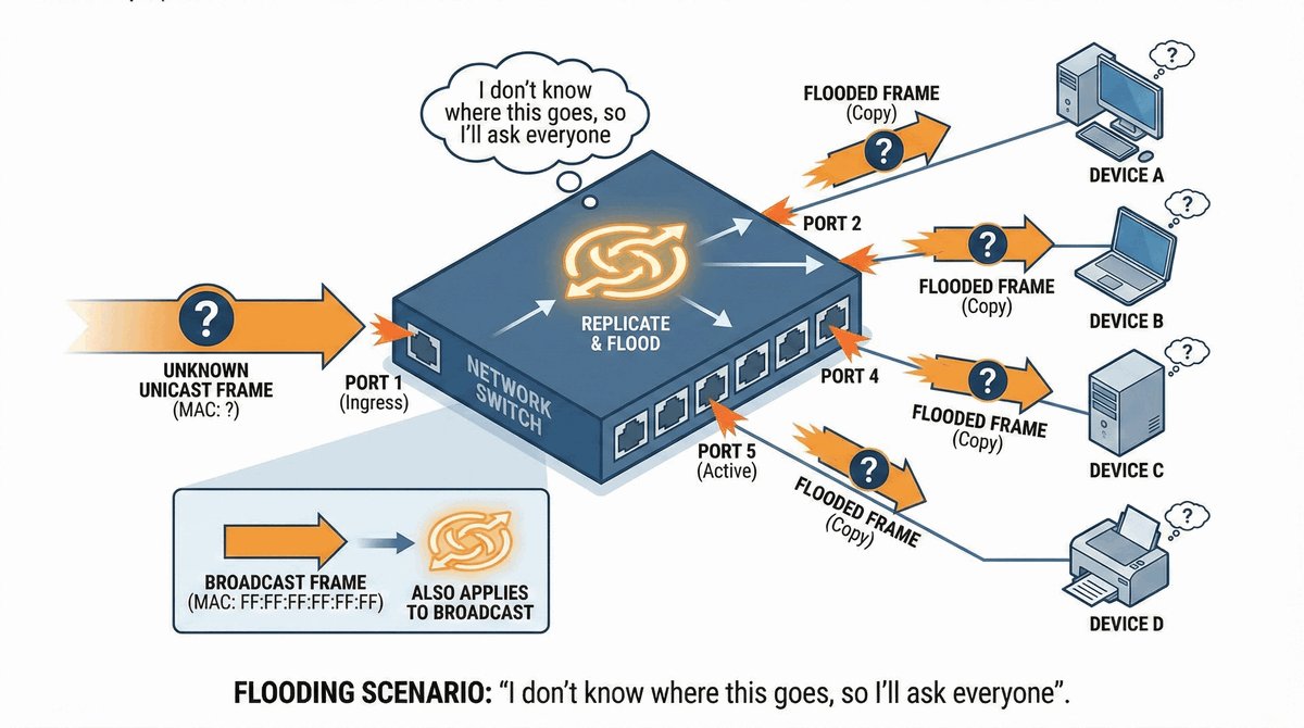 - Występuje, gdy docelowy adres MAC nie figuruje w tablicy CAM (unknown unicast).