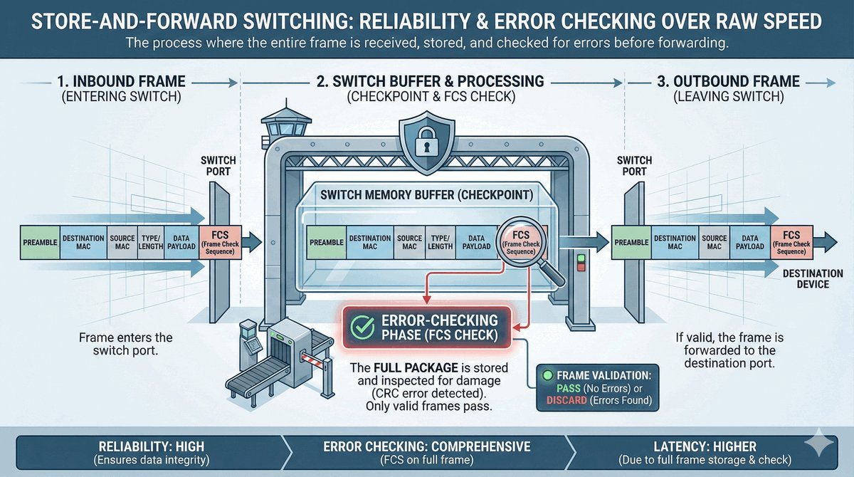- Przełącznik odbiera całą ramkę i zapisuje ją w buforze przed przekazaniem dalej.