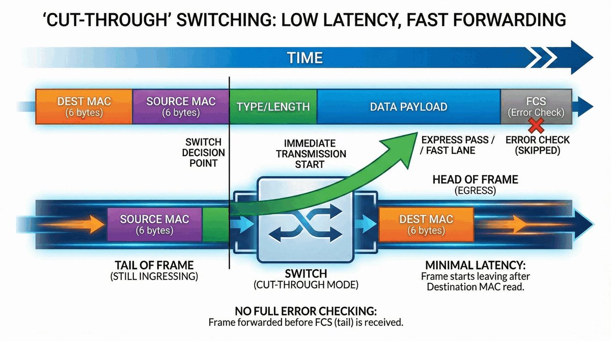 - Przełącznik rozpoczyna przesyłanie ramki natychmiast po odczytaniu adresu MAC odbiorcy.