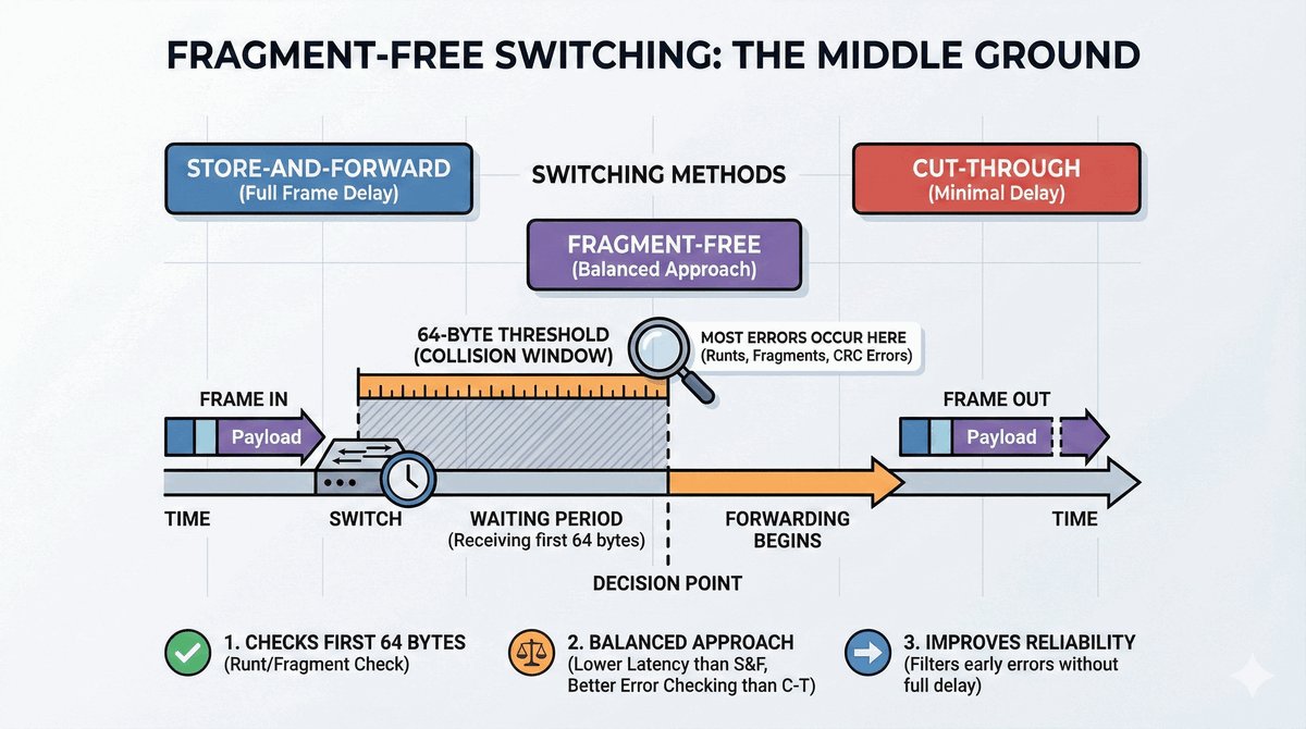 - Główną wadą jest ryzyko przekazywania uszkodzonych ramek (brak sprawdzania FCS).
