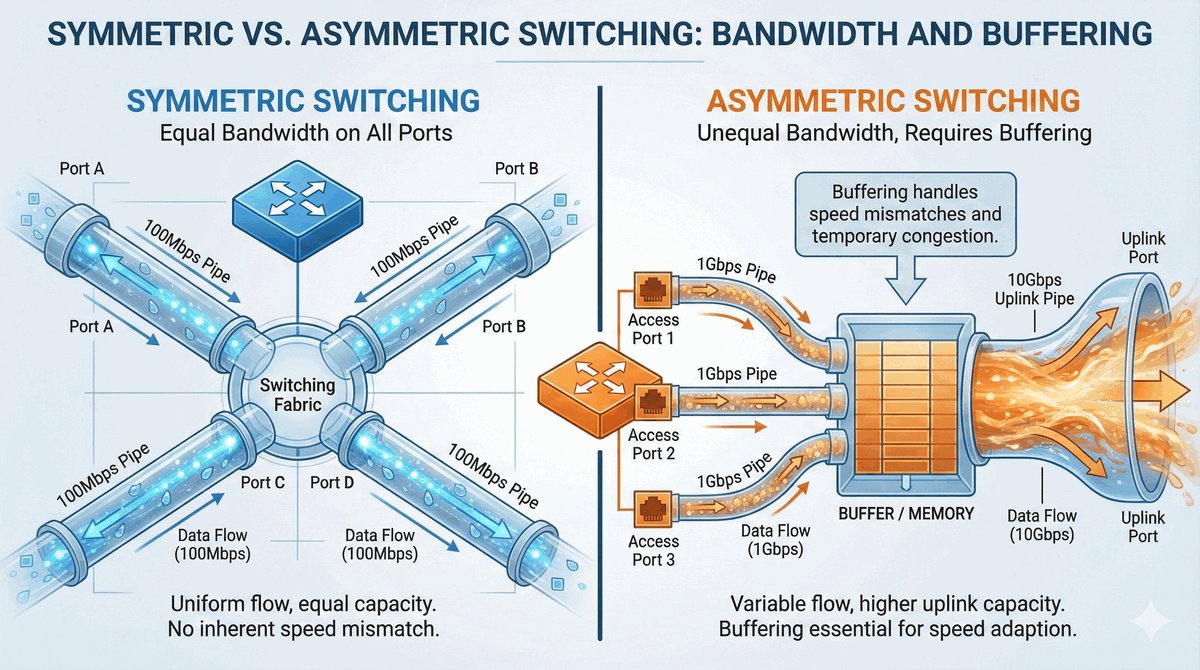 - Przełączanie symetryczne: wszystkie interfejsy operują z tą samą prędkością (np. same porty 1 Gbps).