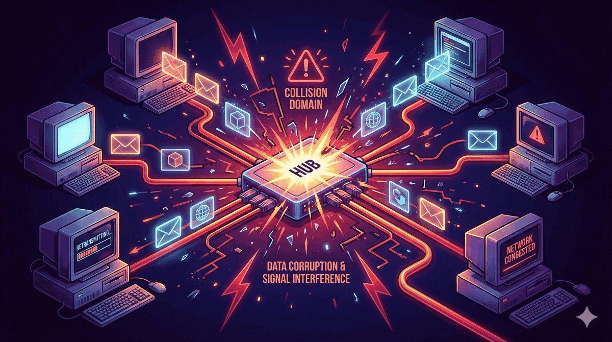 - W dawnych sieciach opartych na koncentratorach cała sieć stanowiła jedną domenę kolizyjną.