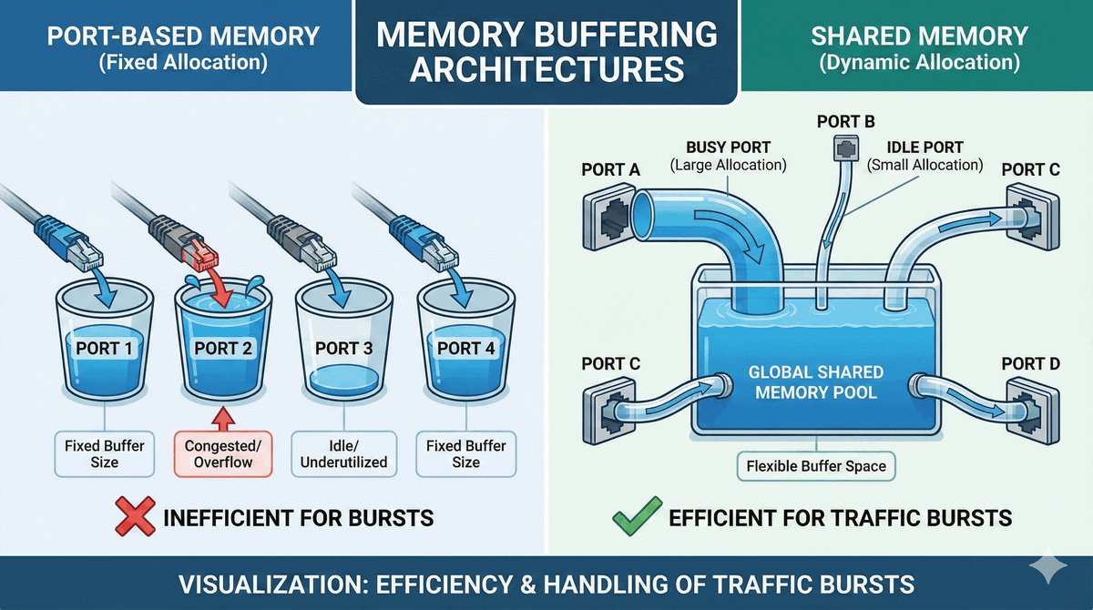 - Współdzielona pamięć (Shared): wszystkie porty korzystają ze wspólnej, dynamicznej puli pamięci.