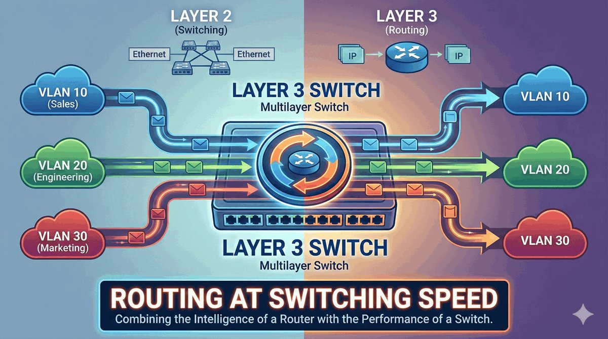 - Zajmują się przekierowywaniem ruchu między różnymi sieciami wirtualnymi (Inter-VLAN Routing).