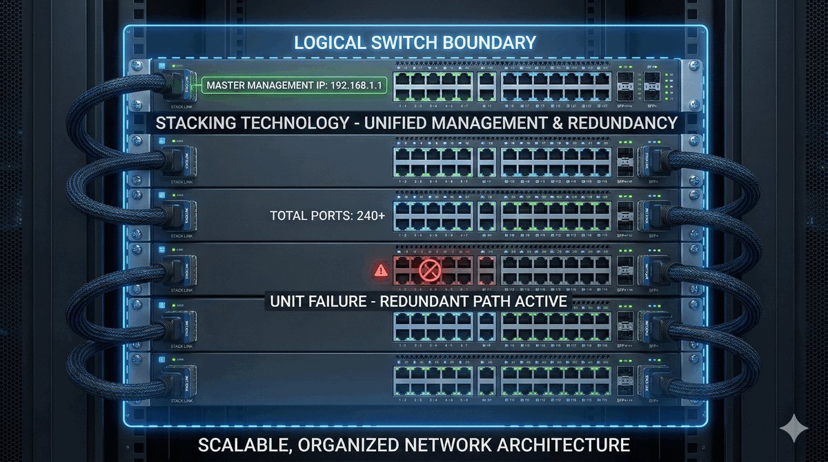 - Cały stos (stack) jest zarządzany pod jednym adresem IP przy użyciu jednej konfiguracji.