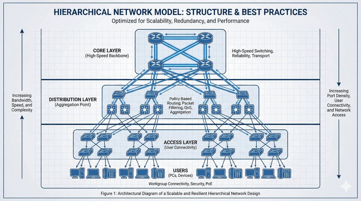 - Optymalny model projektowania sieci firmowych, składający się z trzech poziomów:
