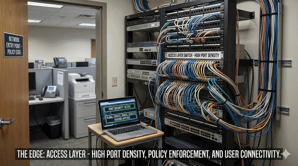 - Warstwa dostępowa (Access Layer): bezpośrednie podłączenie komputerów i użytkowników.