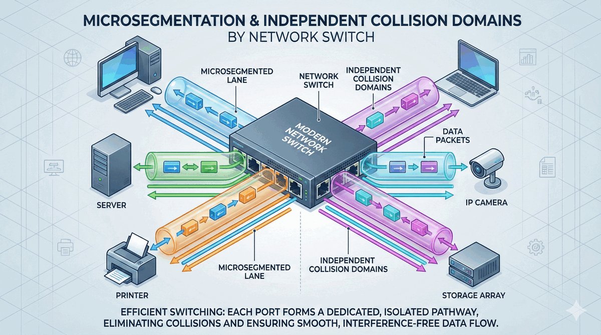 - Przełącznik eliminuje problem kolizji poprzez proces mikrosegmentacji.