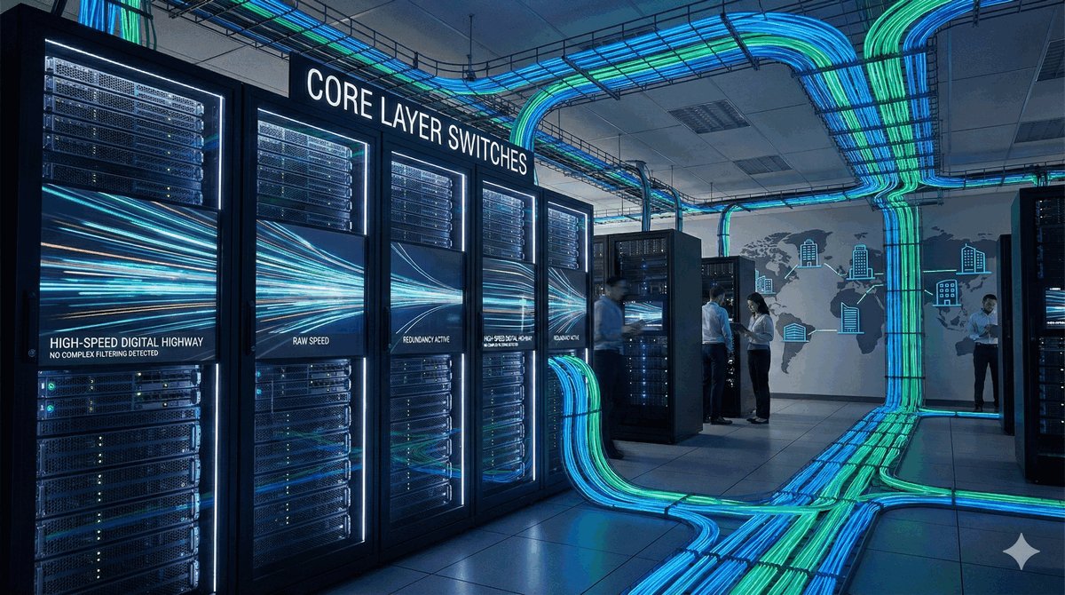 - Warstwa rdzenia (Core Layer): centralny punkt sieci zapewniający superszybki transport danych.