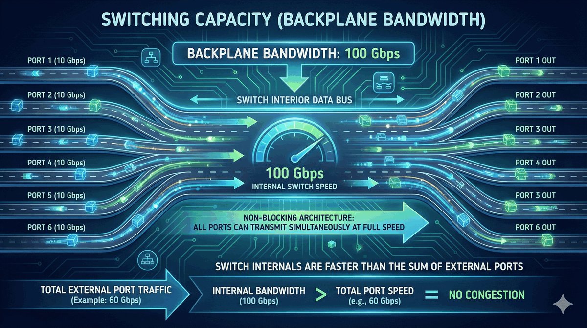 - Gwarantuje to, że przełącznik może obs��użyć pełny ruch na wszystkich portach jednocześnie (nieblokujący).