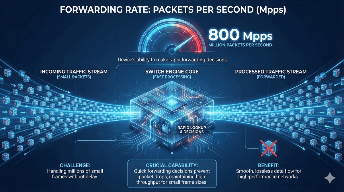 - W dobrych przełącznikach wartość ta pozwala na obsługę ruchu z pełną prędkością kabla (wire speed).