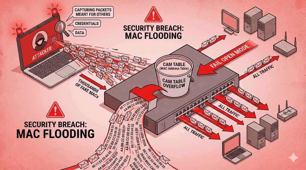 - Gdy tablica CAM jest pełna, przełącznik nie może nauczyć się prawdziwych adresów urządzeń.