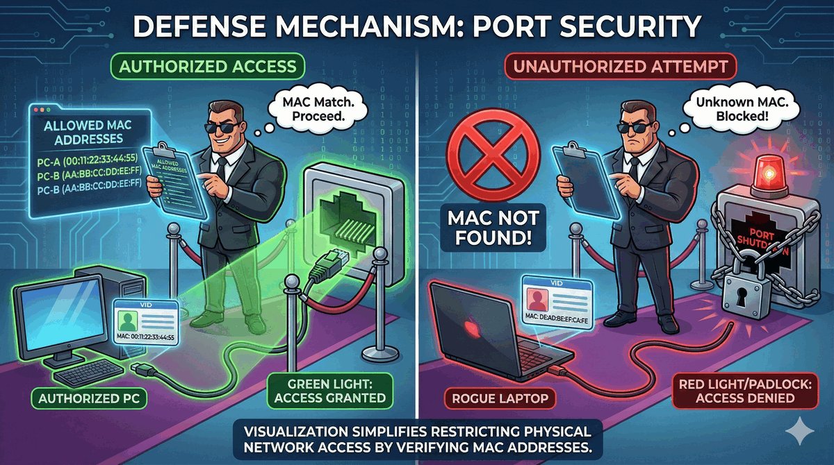 - W przypadku złamania zasady, port może zostać automatycznie zablokowany lub wyłączony (shutdown).