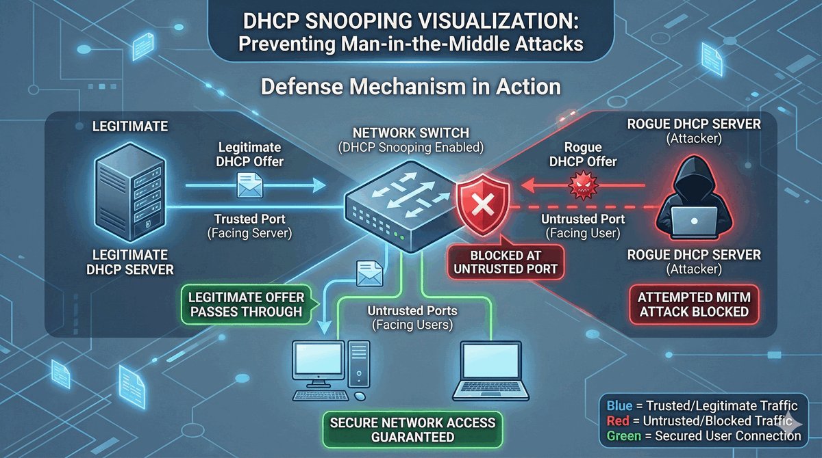 - Zabezpiecza sieć przed podłączeniem fałszywych serwerów DHCP przez nieświadomych użytkowników lub hakerów.