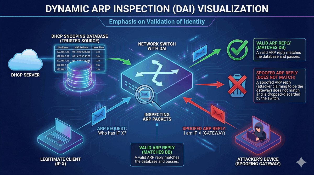 - DAI analizuje każde zapytanie i odpowiedź ARP przechodzącą przez urządzenie.