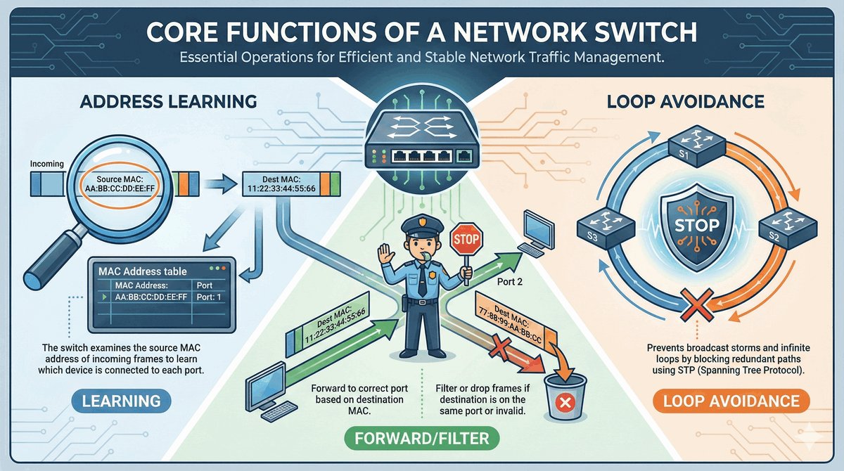 - Te trzy funkcje stanowią fundament działania każdego nowoczesnego przełącznika.