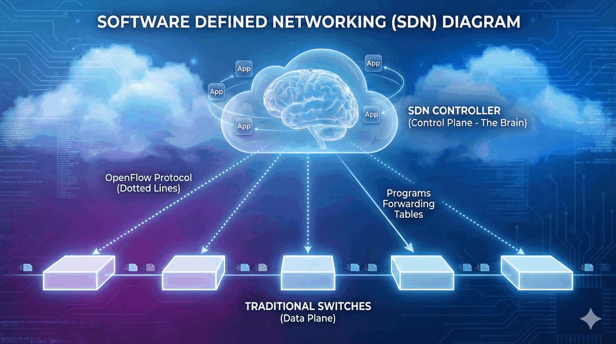 - Cała „inteligencja" sieci i logika sterowania zostaje przeniesiona do centralnego kontrolera (oprogramowania).