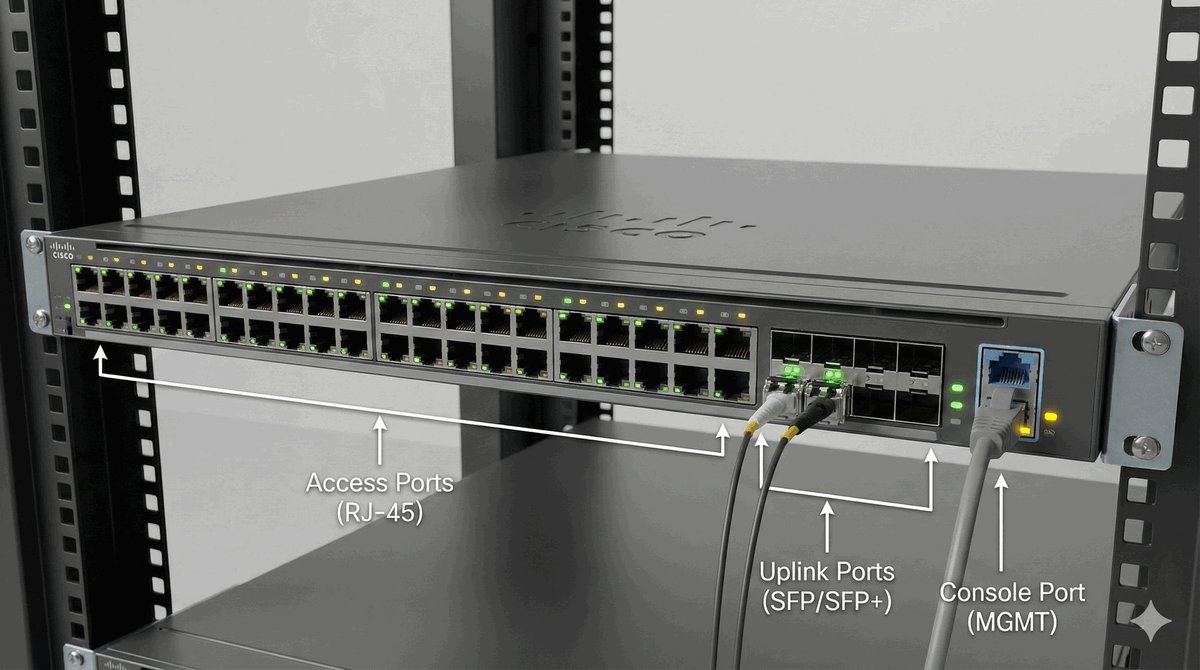 - Porty dostępowe (Access Ports): najczęściej gniazda RJ-45 do podłączania stacji końcowych.