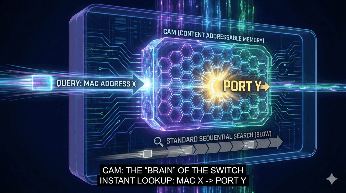 - CAM (Content Addressable Memory) to specjalny, ultraszybki typ pamięci (pamięć adresowana zawartością).