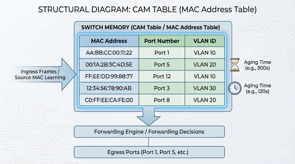 - Przeszukuje tablicę CAM w poszukiwaniu portu skojarzonego z tym adresem.