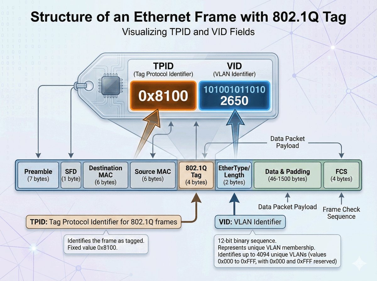 W standardzie 802.1Q kluczową rolę w procesie znakowania ramek odgrywają dwa pola: TPID oraz VID. Pole TPID (Tag Protocol Identifier) to dwubajtowy znacznik o stałej wartości 0x8100. Informuje on urządzenia sieciowe, że dana ramka Ethernet posiada dodatkowy nagłówek i powinna być interpretowana zgodnie z regułami sieci wirtualnych.