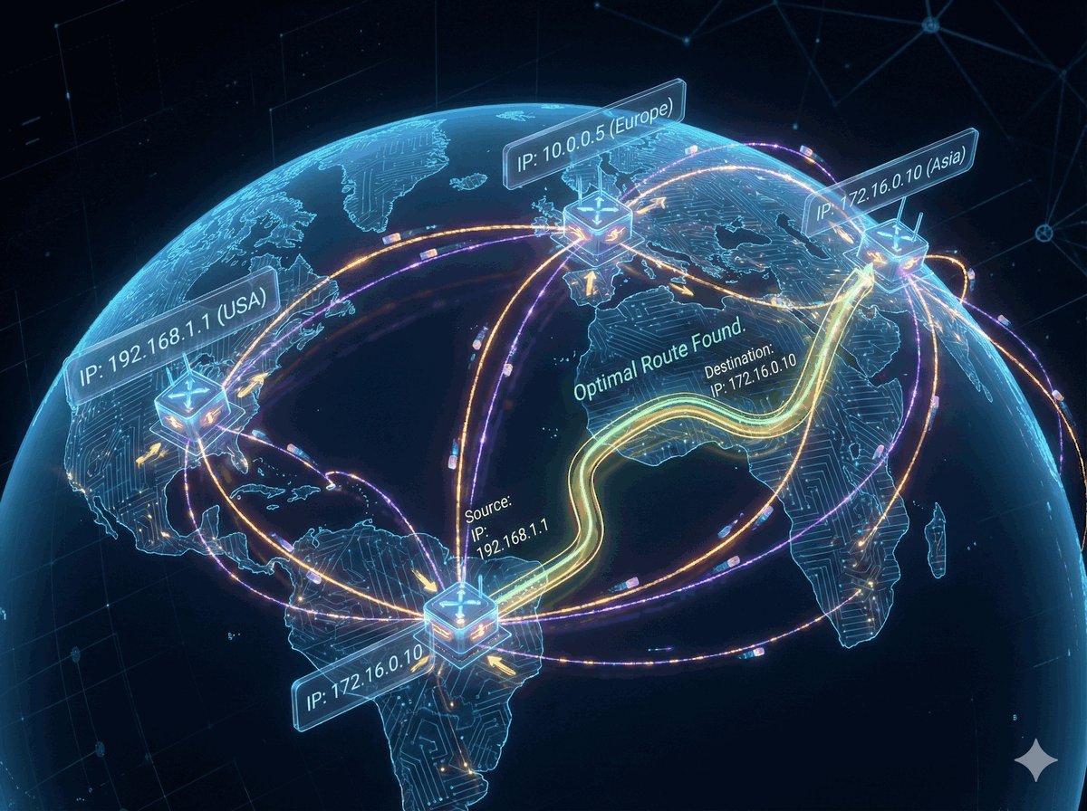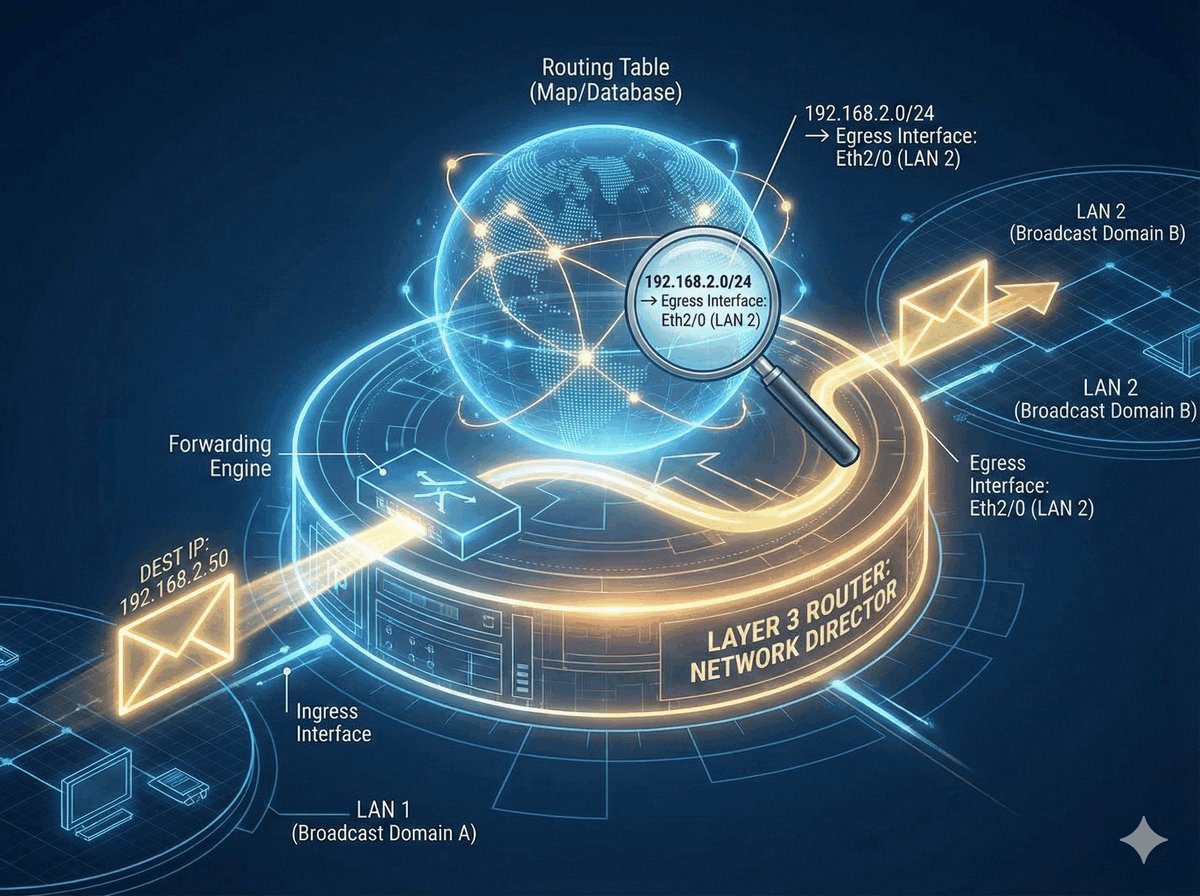 Prawdziwa „magia" dzieje się na routerach. Gdy urządzenie to odbiera pakiet, musi błyskawicznie sprawdzić adres docelowy i zdecydować, przez który ze swoich portów go wypuścić. Każdy interfejs routera to osobny świat (domena rozgłoszeniowa), a router jest jedyną bramą, która pozwala się między nimi przemieszczać.