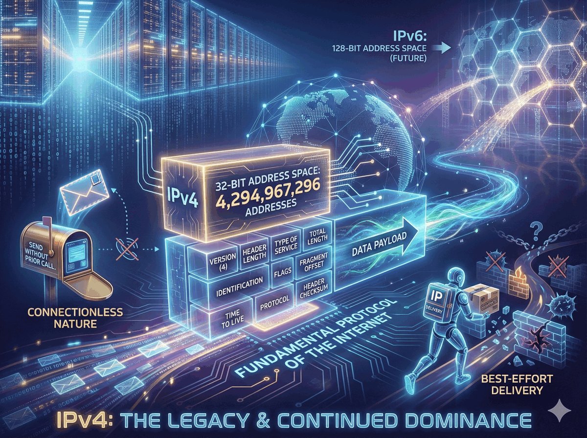 IPv4 działa w modelu „bezpołączeniowym", co oznacza, że wysyła dane bez sprawdzania, czy odbiorca jest gotowy — o to dbają protokoły wyższych warstw (jak TCP). Oferuje on tzw. „best-effort delivery" — routery zrobią wszystko, co w ich mocy, aby dostarczyć pakiet, ale jeśli sieć będzie przeciążona, mogą go bez ostrzeżenia odrzucić. To na inżynierach spoczywa obowiązek takiego zaprojektowania sieci, aby te straty były minimalne.